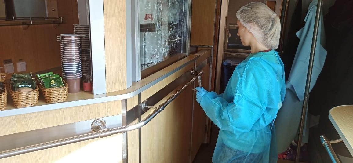 В вагонах-ресторанах и обслуживающих вагонах проведён отбор проб питьевой воды и смывов с объектов внешней среды для лабораторного анализа, исследования проводятся в Центре гигиены и эпидемиологии.